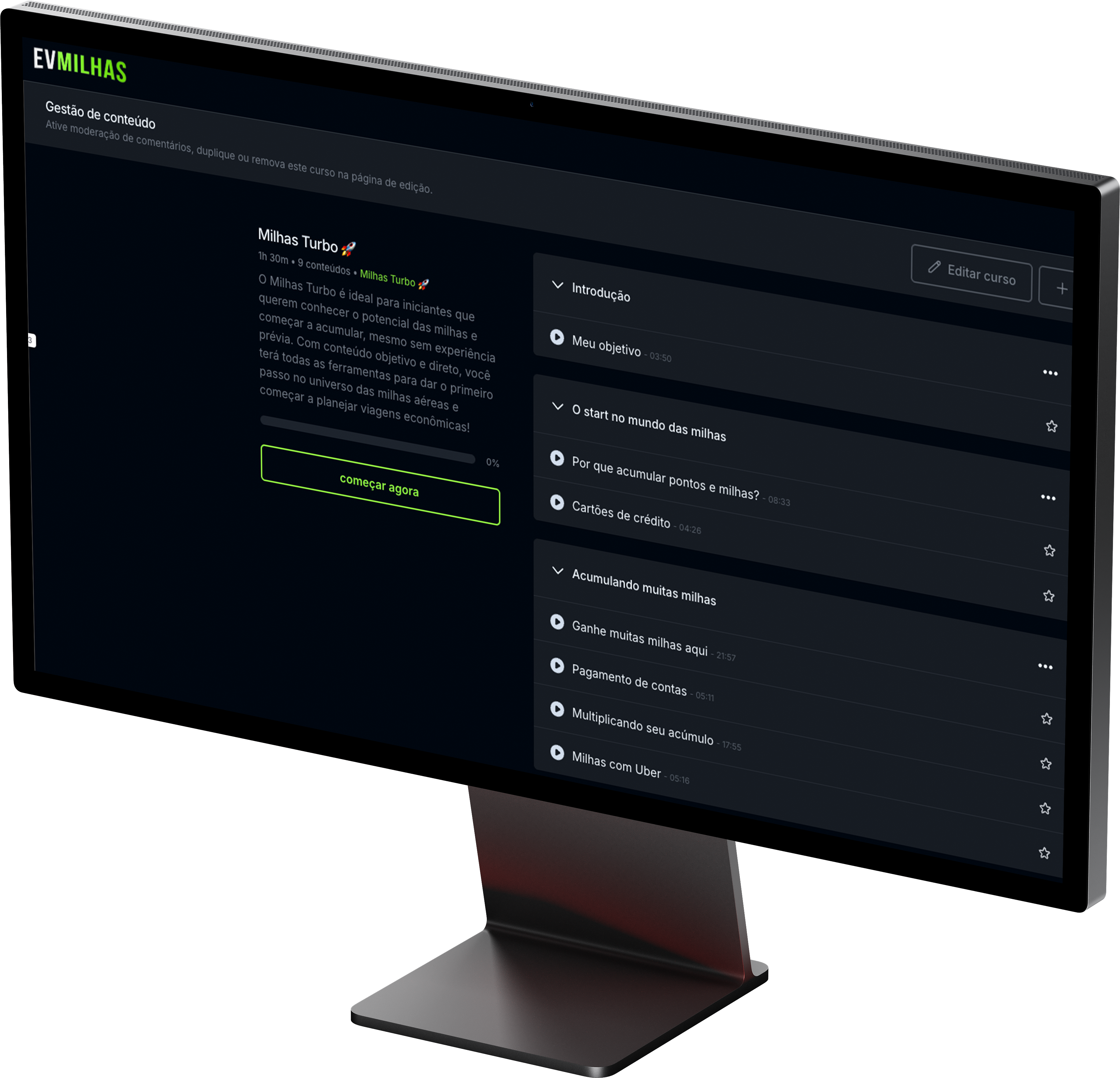 Desde o entendimento do objetivo do curso até como aproveitar compras bonificadas, promoções e até o Uber para gerar milhas, cada aula vai direto ao ponto. Você também aprenderá a multiplicar seu acúmulo e evitar erros comuns que atrapalham sua jornada.